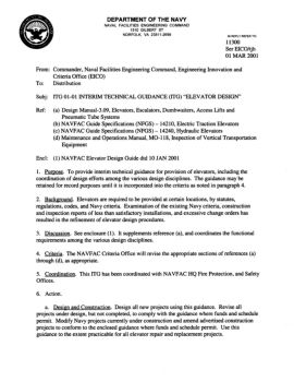 1-1 CHAPTER 1 INTRODUCTION 1-1 Purpose and Scope. This document is intended to reflect Navy policy regarding design and construction of elevators.