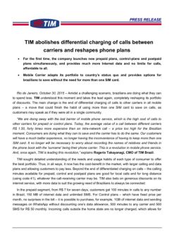 PRESS RELEASE TIM abolishes differential charging of calls between carriers and reshapes phone plans For the first time, the company launches new prepaid plans ...