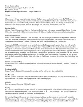 From: Harris, Allatia Sent: Wednesday, August 10, 2011 4:37 PM To: Darland, Nicole Subject: North Campus Personnel Changes for Fall 2011 Friends,