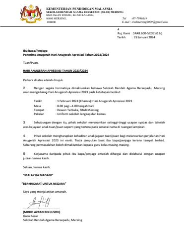 SURAT JEMPUTAN PENERIMA ANUGERAH