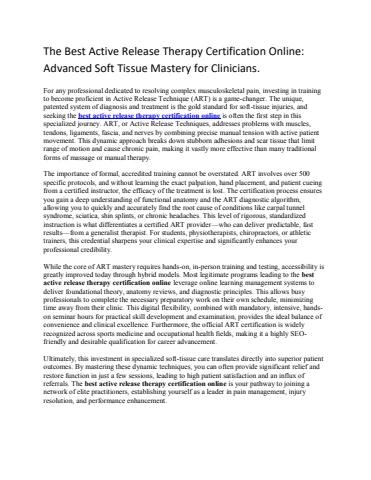 For any professional dedicated to resolving complex musculoskeletal pain, investing in training to become proficient in Active Release Technique (ART) is a game-changer. The unique, patented system of diagnosis and treatment is the gold standard for soft-tissue injuries, and seeking the best active release therapy certification online is often the first step in this specialized journey. ART, or Active Release Techniques, addresses problems with muscles, tendons, ligaments, fascia, and nerves by combining precise manual tension with active patient movement. This dynamic approach breaks down stubborn adhesions and scar tissue that limit range of motion and cause chronic pain, making it vastly more effective than many traditional forms of massage or manual therapy.
