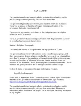 SAN MARINO The constitution and other laws and policies protect religious freedom and, in practice, the government generally enforced these protections.