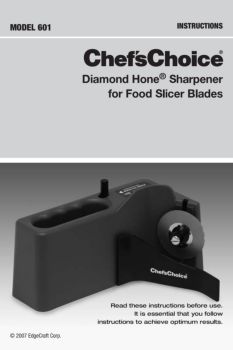 3 UNDERSTANDING THE MODEL 601 SHARPENER The Chef’sChoice®sharpener Model 601 is designed to sharpen slicing blades of most household electric food slicers while ...