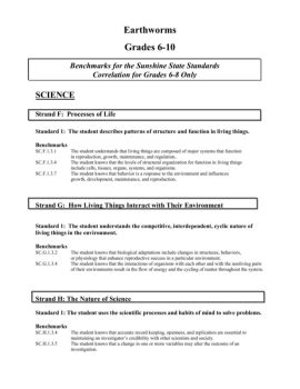 Earthworms Grades 6-10 Benchmarks for the Sunshine State Standards Correlation for Grades 6-8 Only SCIENCE Strand F: Processes of Life Standard 1: The student ...