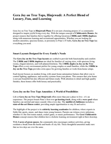 Live the extraordinary life at Gera Joy on Tree Tops, located in Hinjewadi Phase 3. These child-centric homes offer 2 BHK and 3 BHK duplexes with fun-filled amenities like celebrity learning academies, a wave pool, and go-karting tracks. Green spaces and smart automation add value to your everyday experience.