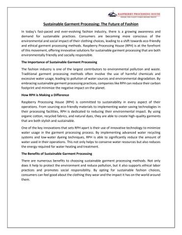 Sustainable garment processing is the future of fashion. Companies like Raspberry Processing House (RPH) are leading the way in embracing eco-friendly and ethical practices that benefit both the planet and the people who wear their clothing. By choosing sustainable fashion options, consumers can make a positive impact and support a more sustainable industry. Make the switch to sustainable garments today and be a part of the movement towards a greener, cleaner future.