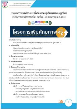 รายงานการอบรมโครงการเพิ่มศักยภาพครูให้มีสมรรถนะครูยุคใหม่ สำหรับการเรียนรู้ศตวรรษที่ 21 วันที่ 22 - 23 พฤษภาคม พ.ศ. 2564