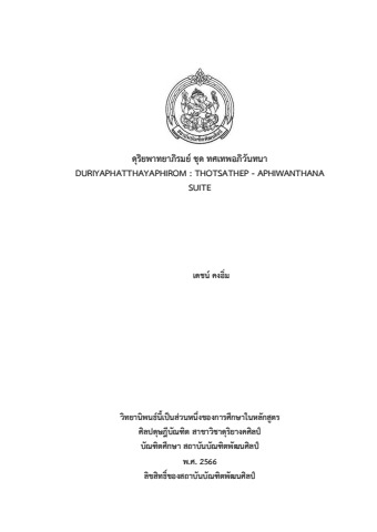 วิทยานิพนธ์ หลักสูตรศิลปดุษฎีบัณฑิต สถาบันบัณฑิตพัฒนศิลป์ สาขาวิชาดุริยางคศิลป์ เรื่อง ดุริยพาทยาภิรมย์ ชุด ทศเทพอภิวันทนา เดชน์ คงอิ่ม 2566