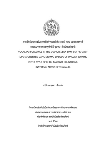 วิทยานิพนธ์ หลักสูตรศิลปมหาบัณฑิต สถาบันบัณฑิตพัฒนศิลป์ สาขาวิชาดุริยางคศิลป์ และสาขาวิชาดุริยางคศิลป์ไทย เรื่อง การขับร้องเพลงในละครดึกดำบรรพ์ เรื่อง คาวี ตอน เผาพระขรรค์ ตามแนวทางของครูทัศนีย์ ขุนทอง (ศิลปินแห่งชาติ) ผู้แต่ง สุเชา บัวแช่ม ปี 2566