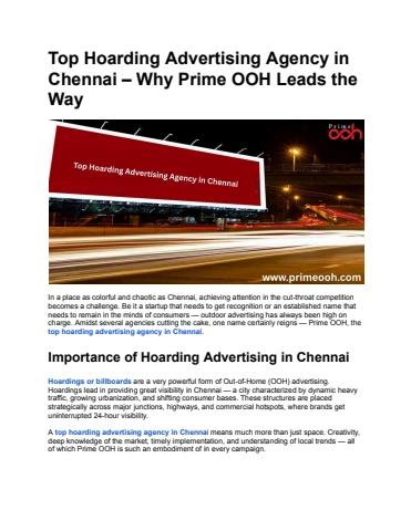 Explore how Prime OOH has become the top hoarding advertising agency in Chennai by combining strategic locations, creative execution, personalized campaigns, and unmatched industry expertise. Learn why leading brands trust Prime OOH to drive visibility and ROI in one of India’s most competitive markets.