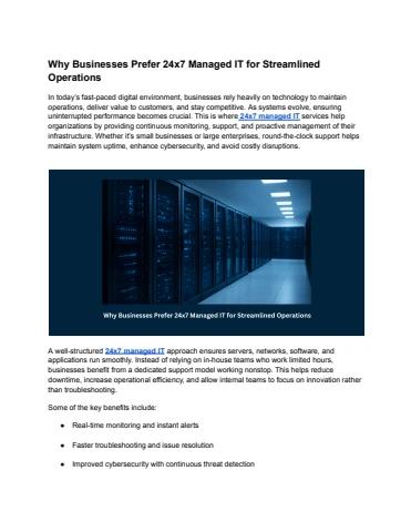 In a world where technology drives business growth, having uninterrupted support is no longer optional — it’s a necessity. Whether it's system maintenance, cloud support, server monitoring, or cybersecurity, 24x7 managed IT helps businesses achieve seamless performance and better operational control.