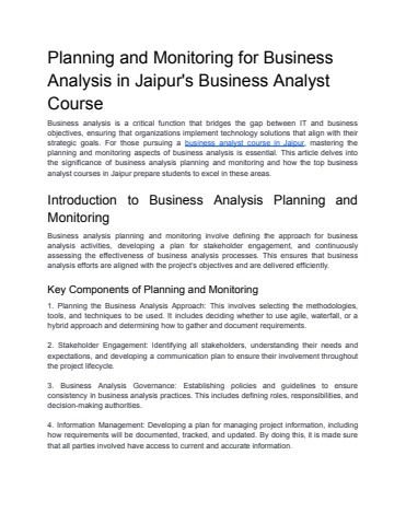 Planning and Monitoring for Business Analysis in Jaipur's Business Analyst Course