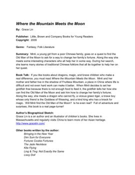 Where the Mountain Meets the Moon By: Grace Lin Publisher: Little, Brown and Company Books for Young Readers Copyright: 2009 Genre: Fantasy; Folk Literature