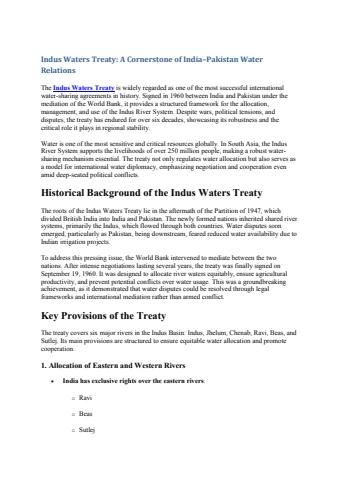 The Indus Waters Treaty is widely regarded as one of the most successful international water-sharing agreements in history. Signed in 1960 between India and Pakistan under the mediation of the World Bank, it provides a structured framework for the allocation, management, and use of the Indus River System.