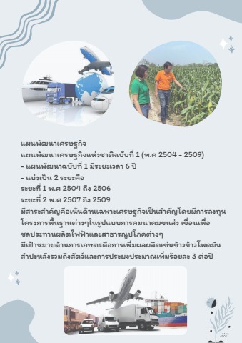 แผนพัฒนาเศรษฐกิจ แผนพัฒนาเศรษฐกิจแห่งชาตฉบับที่ 1 (แผนพัฒนาฉบับที่ 1 มีระยะเวลา 6 ปี - แบ่งเป็น 2 ระยะคือ ระยะที่ 1 พ.ศ 2504 ถึง 2506 ระยะที่ 2 พ.ศ 2507 ถึง 2509