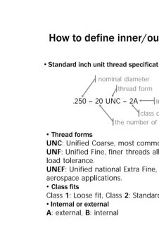 How to define inner/outer thread • Standard inch unit thread specification.250 – 20 UNC – 2A nominal diameter thread form the number of thread per inch