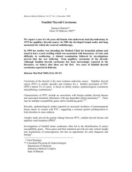 1 Bahrain Medical Bulletin, Vol.22, No. 4, December 2000 Familial Thyroid Carcinoma Sumaya Ghareeb,* Ghazi Al Mahroos, MD** We report a case of a 46 years old female ...