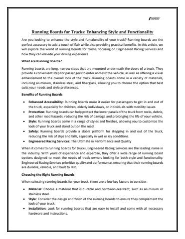 Running boards are long, narrow steps that are mounted underneath the doors of a truck. They provide a convenient step for passengers to enter and exit the vehicle, as well as offering a visual enhancement to the overall look of the truck. Running boards are a practical and stylish addition to any truck, offering a range of benefits from enhanced accessibility to added protection and safety. When choosing running boards for your truck, trust Engineered Racing Services to provide the ultimate in performance and quality. With Our expertise and commitment to excellence, you can rest assured that you are investing in a product that will enhance your driving experience for years to come.