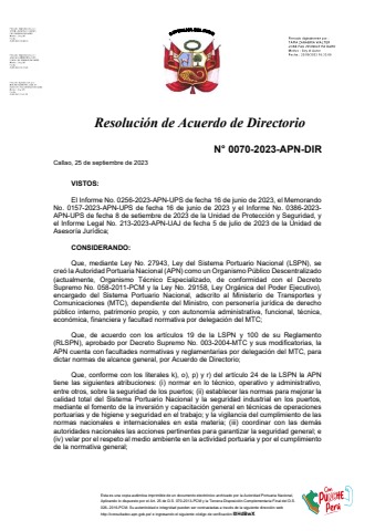 Se publica la Resolución de Acuerdo de Directorio N° 0070-2023-APN-DIR del 25/09/2023, por la cual se aprueban los "Lineamientos para la elaboración de los planes de emergencia de los Terminales Portuarios", que contiene seis (6) anexos, los cuales forman parte de dicha resolución y entrarán en vigencia a los sesenta (60) dias calendario de la publicación de la presente resolución en el Diario Oficial El Peruano.