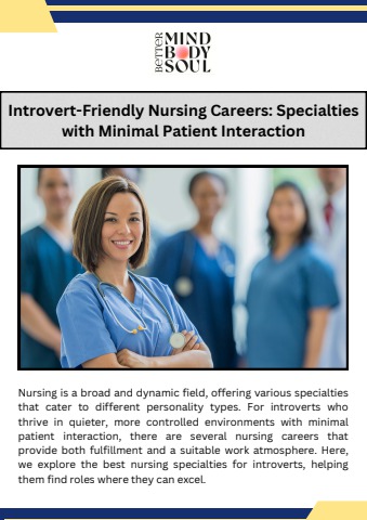 Nursing is a broad and dynamic field, offering various specialties that cater to different personality types. For introverts who thrive in quieter, more controlled environments with minimal patient interaction, there are several nursing careers that provide both fulfillment and a suitable work atmosphere. Here, we explore the best nursing specialties for introverts, helping them find roles where they can excel. Visit us:- https://bettermindbodysoul.com/nurse-personality-type/