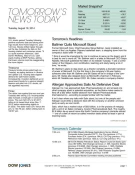 Stocks U.S. stocks gained Tuesday following positive economic data and strong earn-ings results from Home Depot Inc. and TJX Cos. Stocks drifted higher through-