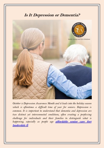 October is Depression Awareness Month and it leads into the holiday season which is oftentimes a difficult time of year for seniors. Depression is common. It is important to understand that dementia and depression are two distinct yet interconnected conditions, often creating a perplexing challenge for individuals and their families to distinguish what is happening, especially as people age. Follow this link https://www.seniorcareauthority.com/blog/is-it-depression-or-dementia/