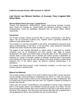 California Avocado Society 1988 Yearbook 72: 229-235 Leaf Scorch and Mineral Nutrition of Avocado Trees Irrigated With Saline Water Samuel Salazar-García and José I ...