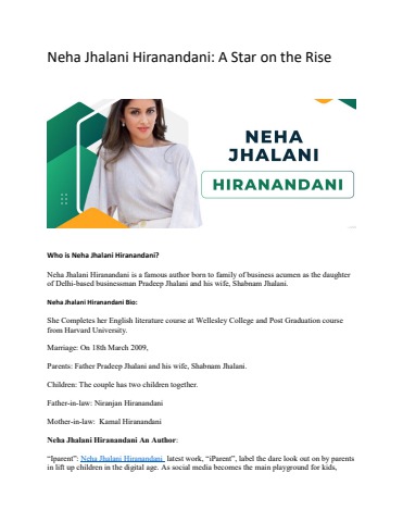 Neha Jhalani Hiranandani is a famous author born to family of business acumen as the daughter of Delhi-based businessman Pradeep Jhalani and his wife, Shabnam Jhalani.