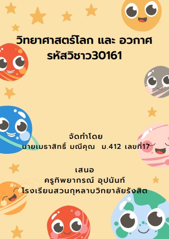 คำนำ หนังสือเล่มเล็กแบบอิเล็กทรอนิกฉบับนี้เป็นส่วนหนึ่งของรายวิชา วิทยาศาสตร์ โลกและอวกาศ รหัสวิชา ว30161 ซึ่งผู้จัดทำได้รับผิดชอบในเนื้อหา ระบบสุริยะ และ เทคโนโลยีอวกาศและการประยุกต์ใช้ ผู้จัดทำหวังว่าผู้อ่านจะไ (2)