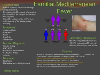 Familial Mediterranean Fever Symptoms: •Abdominal Pain •Chest Pain •Fever •Joint Pain •Skin Lesions Citations •Kastner DL. The systemic autoinflammatory ...