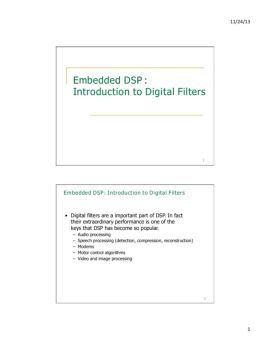 11/24/13 1 Embedded DSP : Introduction to Digital Filters 1 • Digital filters are a important part of DSP. In fact their extraordinary performance is one of the