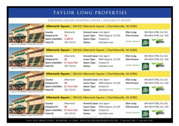 10142 EST BROAD STREET, RCHMOND, A 23060 .TAYLORLONGPROPERTES.CO T: 804.864.9788 F: 804.864.9789 TALO LON POPEIES Albemarle-Square-Availability_Report | Last Updated ...