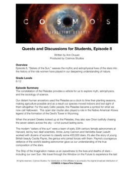 Quests and Discussions for Students, Episode 8 ! Written by Ann Druyan Produced by Cosmos Studios! Overview Episode 8, “Sisters of the Sun,” weaves the mythic and ...