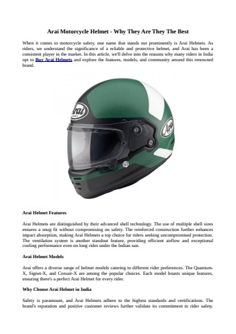 Immerse yourself in unrivaled safety and comfort with Arai Motorcycle Helmets, setting the gold standard in head protection. Meticulously crafted, Arai helmets blend cutting-edge technology with superior design, offering an unparalleled riding experience. Prioritizing rider safety without compromising on style, these helmets stand as a testament to excellence. Elevate your biking journey with the best-in-class Arai Motorcycle Helmet, where innovation meets sophistication, ensuring you ride with uncompromised safety and unmatched style on every adventure.
