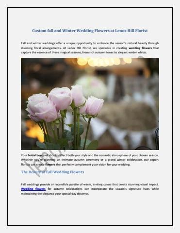 Fall and winter weddings offer a unique opportunity to embrace the season's natural beauty through stunning floral arrangements. At Lenox Hill Florist, we specialize in creating wedding flowers that capture the essence of these magical seasons, from rich autumn tones to elegant winter whites.