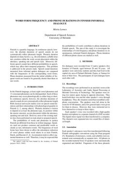 WORD FORM FREQUENCY AND PHONE DURATIONS IN FINNISH INFORMAL DIALOGUE Mietta Lennes Department of Speech Sciences University of Helsinki ABSTRACT Finnish is a quantity ...
