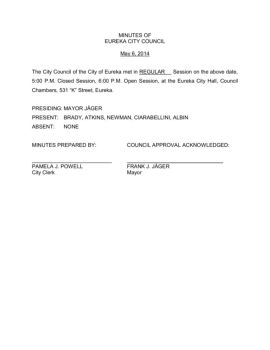 MINUTES OF . EUREKA CITY COUNCIL . May 6, 2014 . The City Council of the City of Eureka met REGULARin . Session on the above date, 5:00 P.M. Closed Session, 6:00 P.M ...
