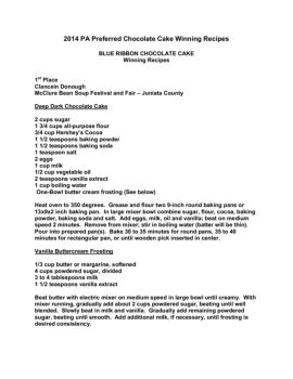2014 PA Preferred Chocolate Cake Winning Recipes WHITE RIBBON CHOCOLATE CAKE Winning Recipes 3rd Place Christy Wiltrout Bullskin Township Fair – Fayette County