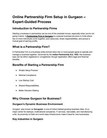 Starting a business in partnership can be one of the smartest moves, especially when you're not going it alone. A Partnership Firm in Gurgaon is a popular business structure in India where two or more individuals come together, pool resources, share responsibilities, and pursue a mutual goal of earning profits.