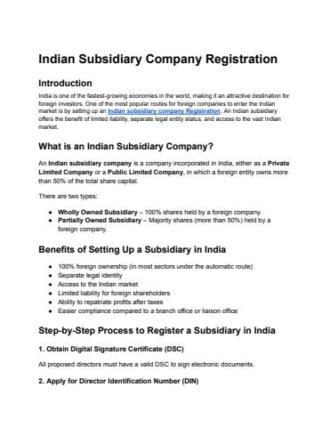 India is one of the fastest-growing economies in the world, making it an attractive destination for foreign investors. One of the most popular routes for foreign companies to enter the Indian market is by setting up an Indian subsidiary company Registration. An Indian subsidiary offers the benefit of limited liability, separate legal entity status, and access to the vast Indian market.